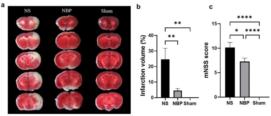 TTC染色顯示,與生理鹽水(NS)組相比,NBP治療組的梗死面積顯著減少(圖2a和b)。此外,NBP組也表現出較輕的神經功能缺損癥狀(圖2c)。這些結果表明,NBP對腦缺血再灌注損傷模型的神經功能具有良好的保護作用。
