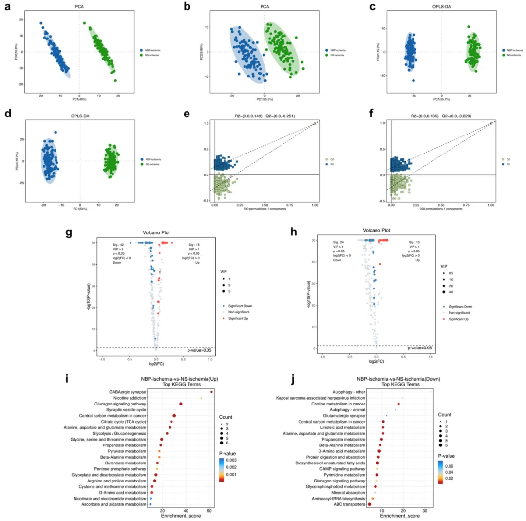 運用空間代謝組學(SM)研究NBP對代謝物譜的影響。主成分分析(PCA)揭示了兩組之間不同的代謝物模式(圖3a和b),正交偏最小二乘法判別分析(OPLS-DA)顯示了聚類和分組差異(圖3c和d)。置換測試通過7倍交叉驗證和200個響應來評估模型的質量,表明兩組結果沒有過擬合(圖3e和f)。在負電離模式下鑒定出481種代謝物,在正電離模式下鑒別出295種代謝物。在負離子模式下,有18種上調的代謝物和42種下調的代謝物,在正離子模式下有13種上調的代謝產物和24種下調的代謝產物(圖3g和h)。隨后的分類和通路富集分析揭示了NBP影響的關鍵代謝通路(圖3i和j)。