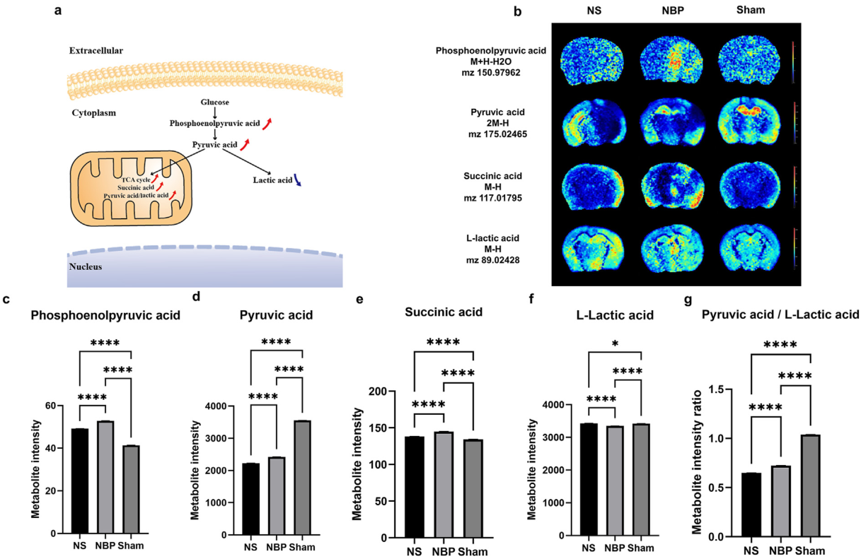 大腦極易發生局部缺血,盡管只占其體重的2%,但消耗了人體約20-25%的氧氣和葡萄糖。不間斷的能量供應對腦組織功能至關重要,外源性(如氧氣和葡萄糖)或內源性(如線粒體功能障礙)因素造成的中斷均可能導致不可逆的損傷。KEGG通路富集分析表明,NBP上調了與丙酮酸代謝和檸檬酸循環相關的通路,這兩者都是能量供應所必需的(圖3i)。圖4a顯示了詳細的能量供應機制的示意圖。NBP組能量相關代謝物的水平,包括磷酸烯醇丙酮酸、丙酮酸和琥珀酸,顯著上調,而乳酸水平顯著下調(圖4b-f)。這些發現表明NBP組的線粒體有氧呼吸能量供應系統顯著增強。此外,丙酮酸與L-乳酸比例的增加(圖4g)同樣表明NBP組的線粒體功能增強,綜上結果顯示線粒體是NBP的潛在靶點。