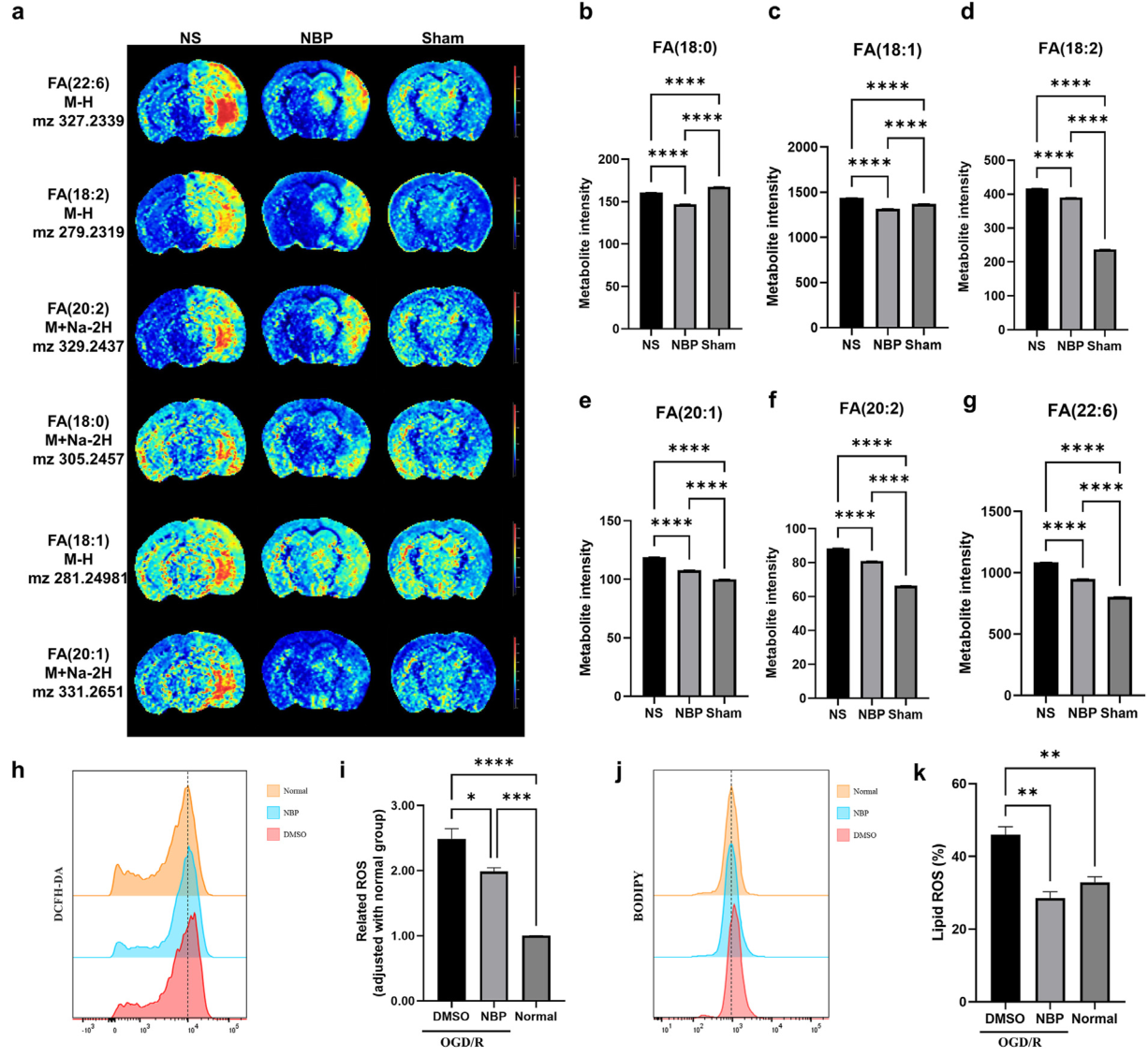 脂質代謝在維持正常細胞功能方面至關重要,有研究表明,多不飽和脂肪酸(PUFA)參與調節鐵死亡,鐵死亡是一種參與缺血再灌注損傷的細胞死亡方式。研究結果顯示,NBP可以抑制不飽和脂肪酸的生物合成途徑(圖3j),通過定量分析也證實了NBP參與到PUFA的生物合成途徑中(圖7a-g),表明鐵死亡可能是NBP改善神經功能的潛在機制之一。此外,ROS作為鐵死亡的重要指標,在細胞模型中,NBP也表現出降低ROS(圖7h和i)和脂質ROS(圖7j和k)的作用。綜上結果表明,NBP可能通過抑制不飽和脂肪酸的生物合成來抑制鐵死亡,從而發揮神經保護作用。