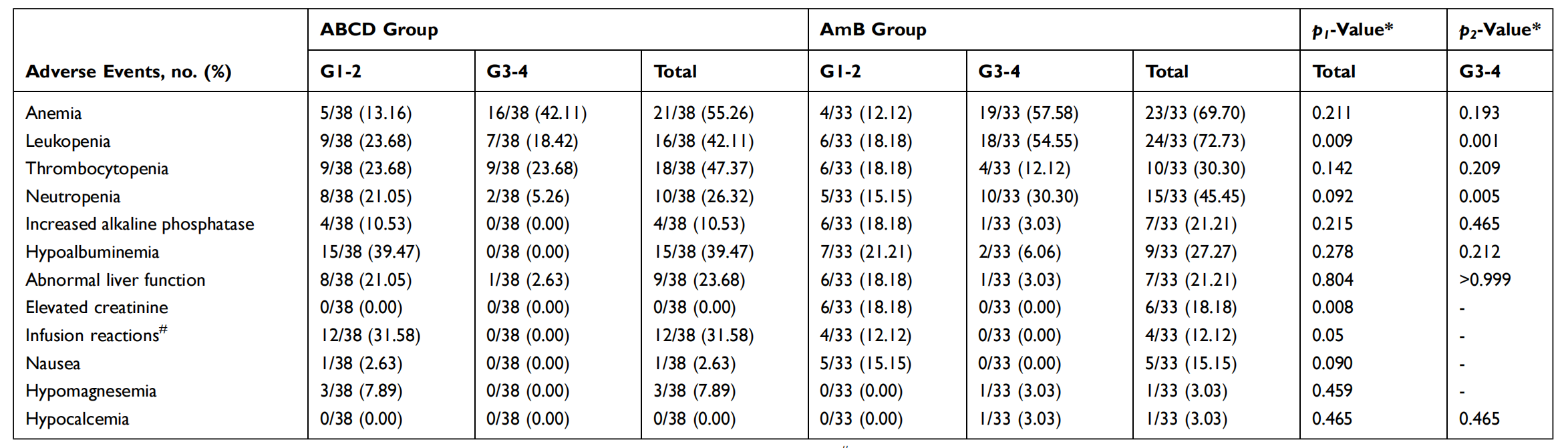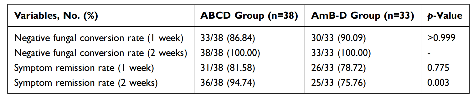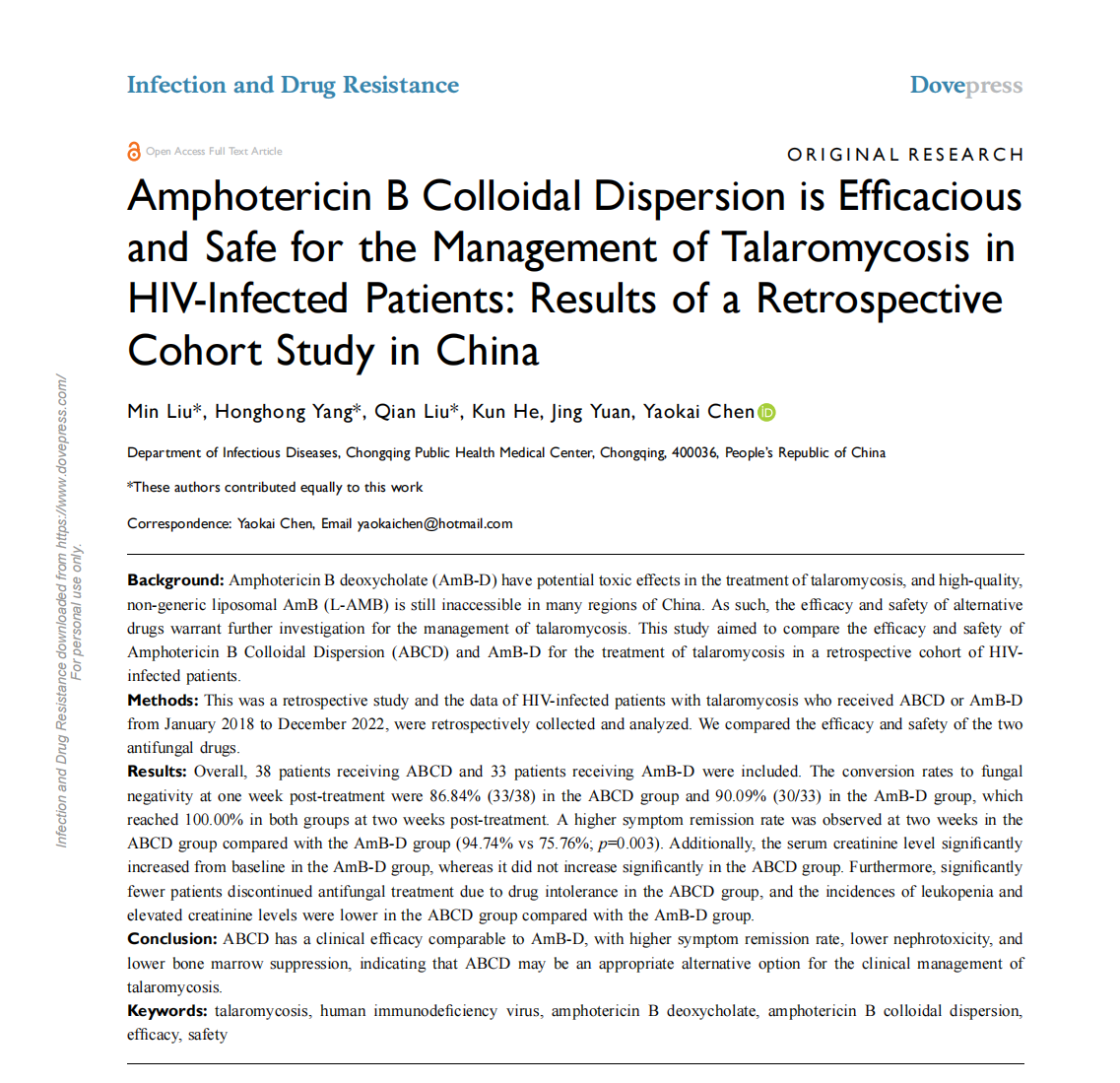 近期,《Infection and Drug Resistance》(2024,IF2.9,DOI: 10.2147/IDR.S481856)發表了一項由重慶市公共衛生醫療救治中心感染科陳耀凱教授牽頭開展的,既往接受過ABCD或AmB-D治療的HIV陽性馬爾尼菲藍狀菌病回顧性研究的結果,旨在比較ABCD和AmB-D在HIV陽性馬爾尼菲藍狀菌病患者的療效和安全性。一項回顧性研究,研究對象為2018年1月至2022年12月期間接受過ABCD或AmB-D治療的HIV陽性馬爾尼菲藍狀菌病的患者。通過收集其相關病例資料,比較了兩種抗真菌藥物的療效和安全性。共納入38例接受ABCD治療的患者、33例接受AmB-D治療的患者。ABCD組治療一周后的真菌陰轉率為86.84%(33/38),AmB-D組為90.09%(30/33),兩組在治療后兩周后真菌轉陰率均達到100.00%。與AmB-D組相比,ABCD組在兩周時的癥狀緩解率更高(94.74% vs 75.76%; P=0.003)。此外,AmB-D組血清肌酐水平較基線顯著升高,而ABCD組無顯著升高。并且,與AmB-D組相比,ABCD組因藥物不耐受而停止抗真菌治療的患者明顯減少,白細胞降低和肌酐水平升高的發生率更低。ABCD的臨床療效與AmB-D相當,具有更高的癥狀緩解率,更低的腎毒性和更低的骨髓抑制,提示ABCD可能是臨床治療馬爾尼菲藍狀菌病的合適的替代選擇。
