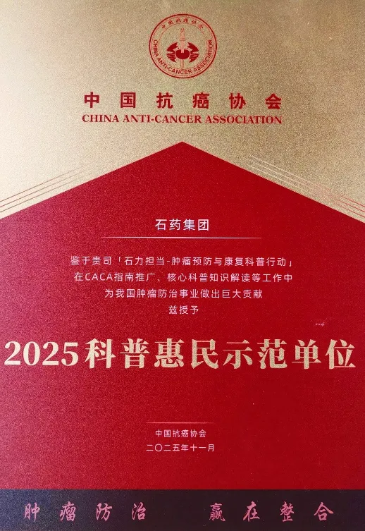 石藥集團榮獲中國抗癌協會“2025年科普惠民示范單位”
