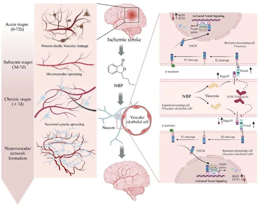 研究結果表明, NBP通過重塑微血管系統以促進神經修復,有效治療缺血性卒中。VIM被確定為NBP 的新靶點,這為探索VIM在神經血管耦合中的作用奠定了基礎。進一步機制研究顯示,NBP通過靶向VIM調控Notch信號通路,進而促進缺血性卒中后的血管新生與神經修復。