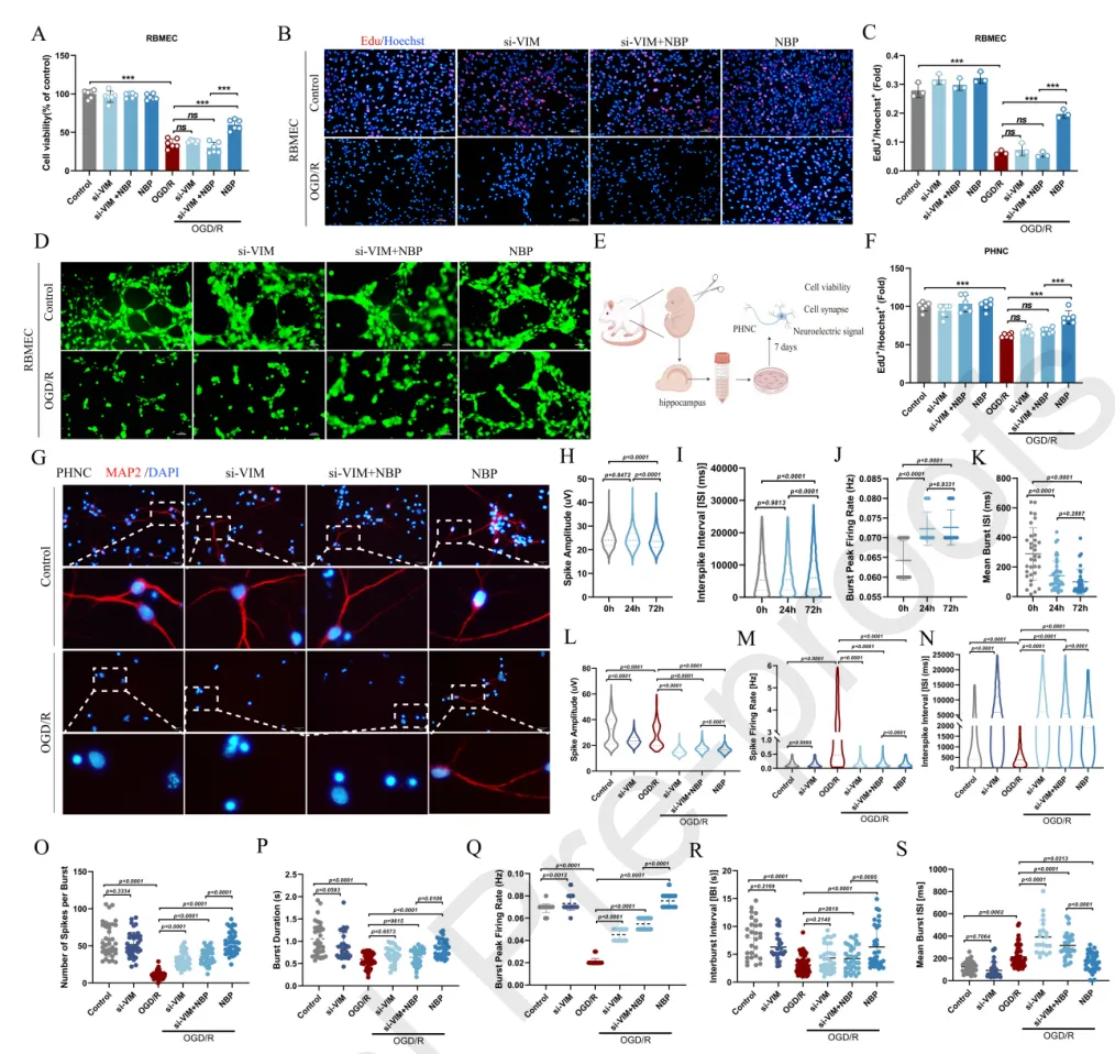 結果三:建立OGD/R誘導的細胞損傷模型,通過敲低技術探究VIM的功能,結果表明VIM敲低顯著抑制了NBP的保護作用,NBP需要依賴VIM來促進血管新生。