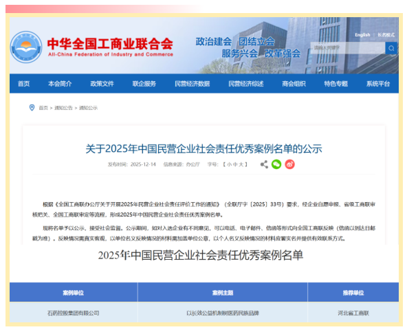 近日,由全國工商聯組織的2025年“中國民營企業社會責任優秀案例”評選結果正式揭曉,石藥控股集團有限公司憑借在社會責任領域的持續投入與創新實踐,成功入選該權威名單。這一榮譽不僅是對石藥集團社會責任工作的充分肯定,也彰顯了企業在推進健康中國建設上的示范引領作用。