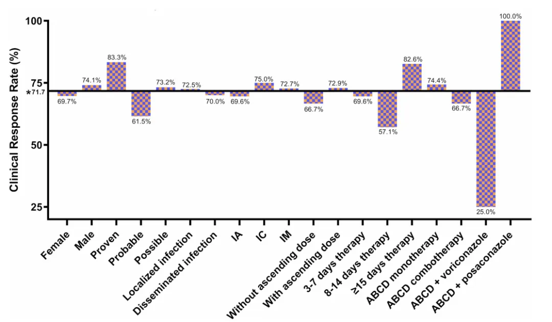 在納入的60例患者中,ABCD的臨床應(yīng)答率為71.7%(43/60;95% 置信區(qū)間[CI]:59.2%~81.5%)。ABCD單藥治療和聯(lián)合治療的臨床應(yīng)答率分別為74.4%(29/39)和66.7%(14/21),差異無統(tǒng)計(jì)學(xué)意義(P=0.528)。各亞組患者的臨床應(yīng)答率見圖1,亞組分析顯示,性別、基礎(chǔ)疾病、感染部位及既往抗真菌治療均未對療效產(chǎn)生顯著影響。肝毒性、腎毒性和輸注相關(guān)反應(yīng)的發(fā)生率分別為13.3%、23.3%和1.7%。