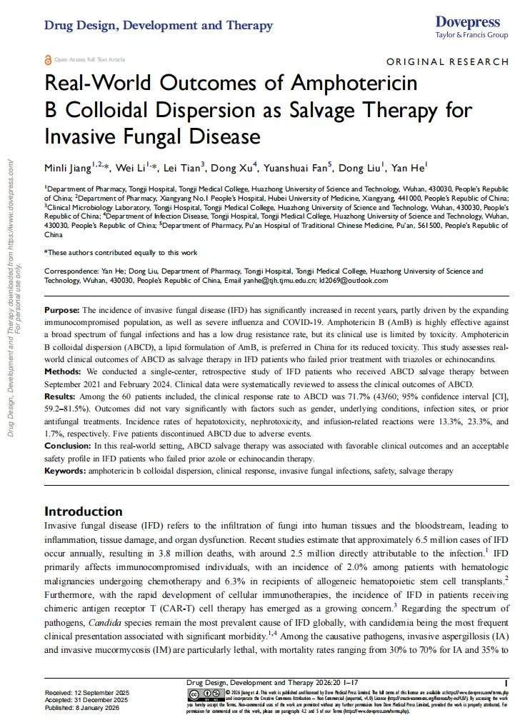 Jiang M, Li W, Tian L, Xu D, Fan Y, Liu D, He Y. Real-World Outcomes of Amphotericin B Colloidal Dispersion as Salvage Therapy for Invasive Fungal Disease. Drug Des Devel Ther. 2026;20:1-17