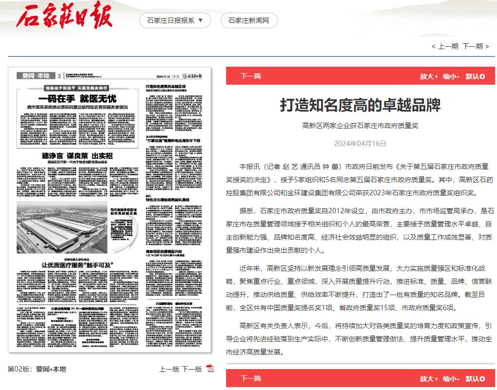 打造知名度高的卓越品牌——高新區(qū)兩家企業(yè)獲石家莊市政府質量獎
